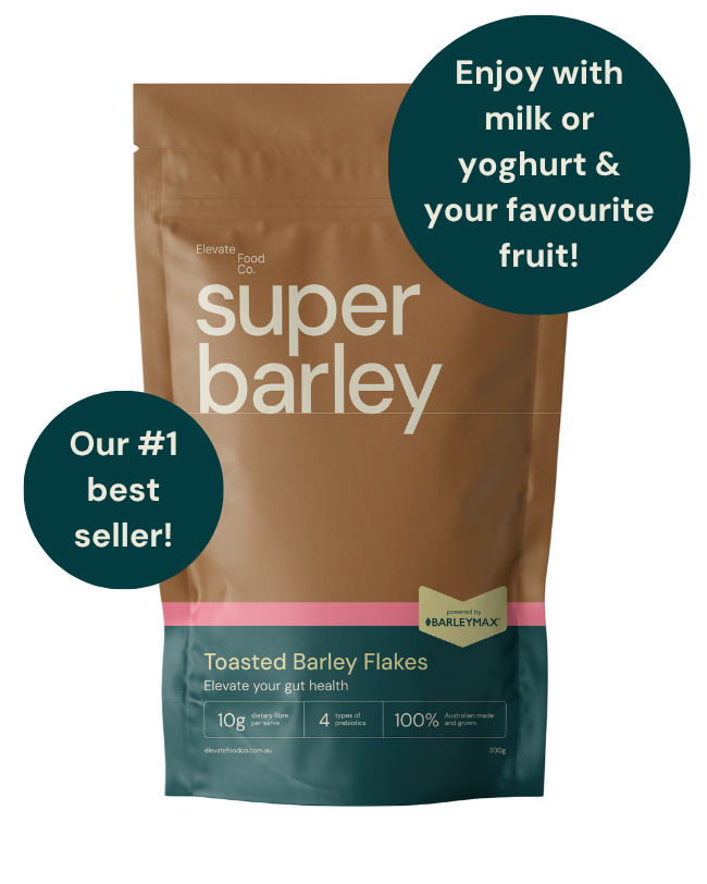 Super Barley contains a unique combination of four prebiotics in their natural matrix to support the healthy functioning of your gut microbiome. When you add Elevate Food Co. Super Barley to your meals, you're actively elevating your gut - and overall - health, one spoonful at a time. Level up your health today.